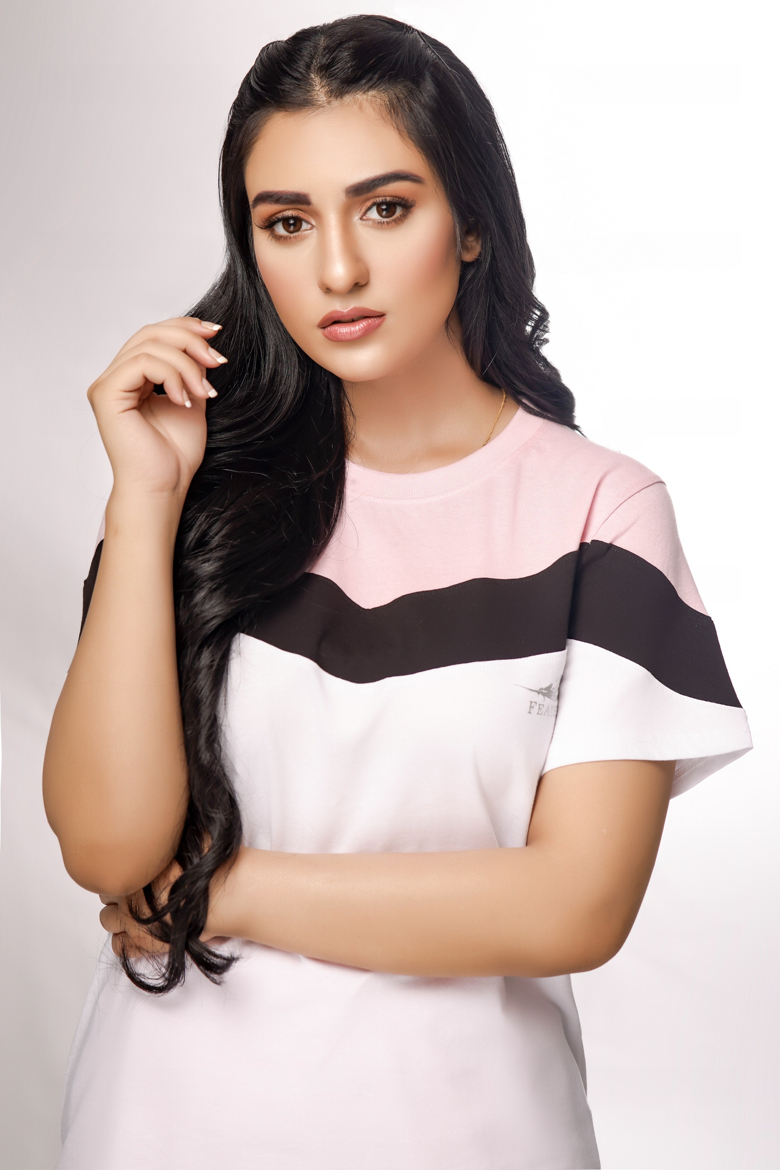 Outfit: The article composes of white tees with light pink neckline bordered with black narrow strip. The outfit is complimented with light pink strip teased pants.